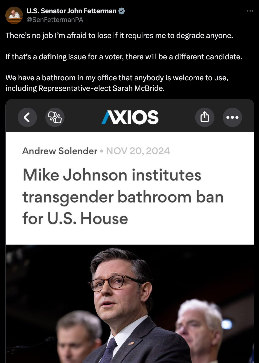 By contrast, John Fetterman, who also represents a swing state, undertook the exercise and came up with something principled and defiant.