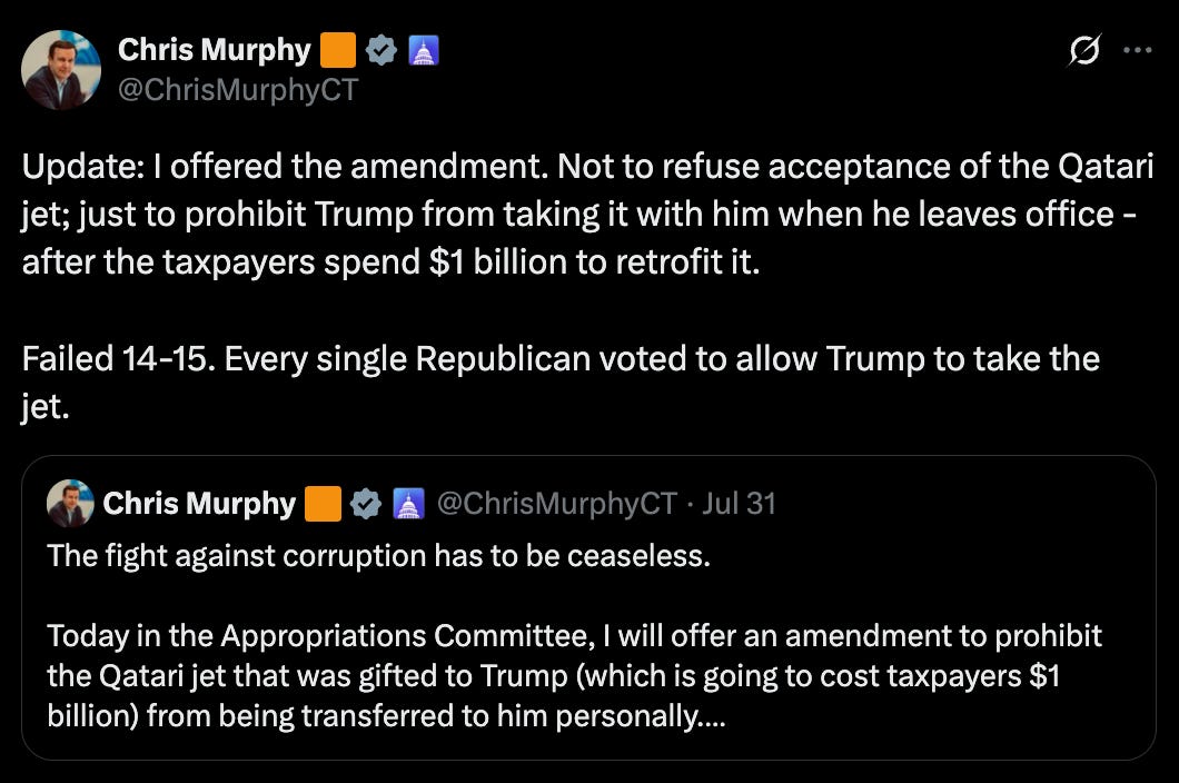 But whatever they choose to do, they can make the Qatari airplane and the White House palace conversion regular sticking points. Force Republicans to vote repeatedly to funnel those taxpayer dollars into Trump’s personal luxury account. Ideally: filibuster any legislation that funds Trump’s lavish lifestyle.