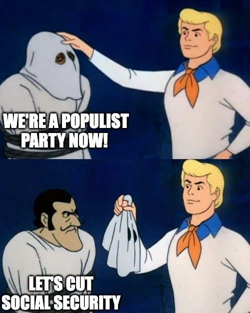 I assign almost no significance to the fact that Trump himself claims to oppose cutting Social Security. It’s not clear he understands the significance of any of these programs beyond the fact that they’re politically perilous to cut—and he’s a huge liar. If he thought repealing Social Security outright would glorify or enrich him in a significant way, he’d abandon his pledge in a heartbeat.