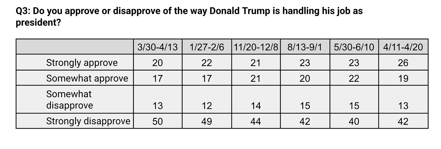 This can’t really happen without MAGA shrinking. Committed Trump fans still surely support Trump, but millions have softened from strong to weak support. And for every new respondent who only “somewhat approves,” a former “somewhat approver” crosses the fifty-yard line to become a “somewhat disapprover.” And the shift propagates all the way through the spectrum. When you tally it all up, Trump’s strong approval has fallen, and strong disapproval climbed, in basically equal measure.